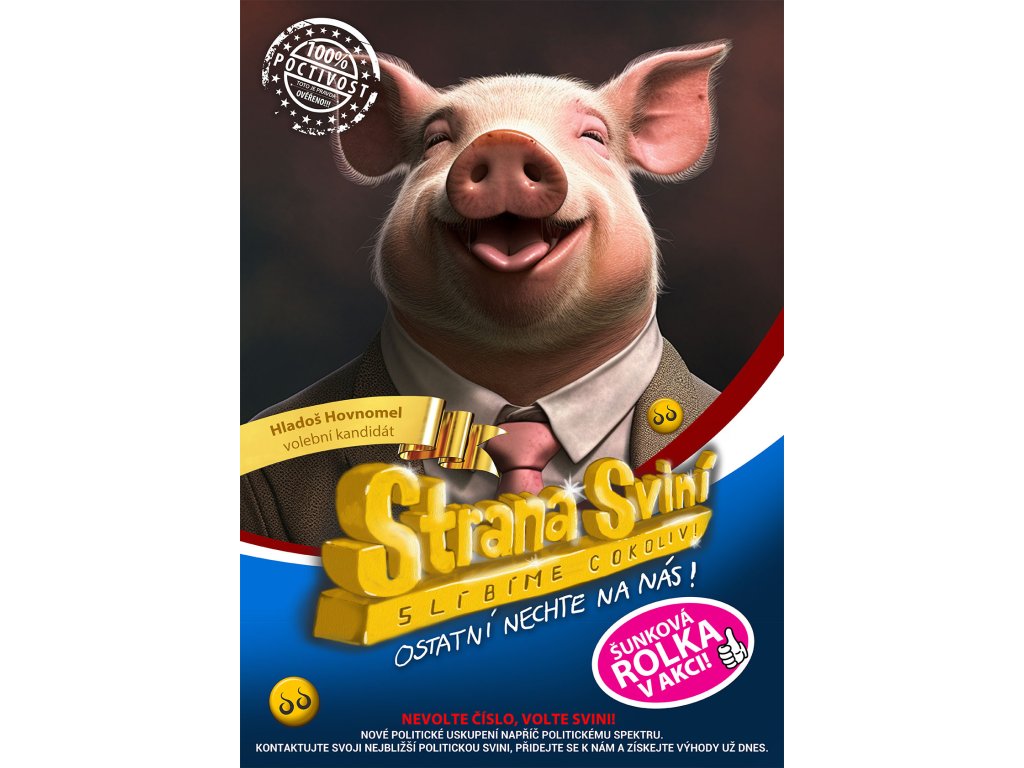 Oficiální propagační plakát Strany Sviní (SS). První, legální, otevřená. Slíbíme cokoliv, ostatní nechte na nás. Dejte nám svůj hlas a my budeme říkat věci za vás z našich úst. Strana pro všechny voliče celého volebního spektra.